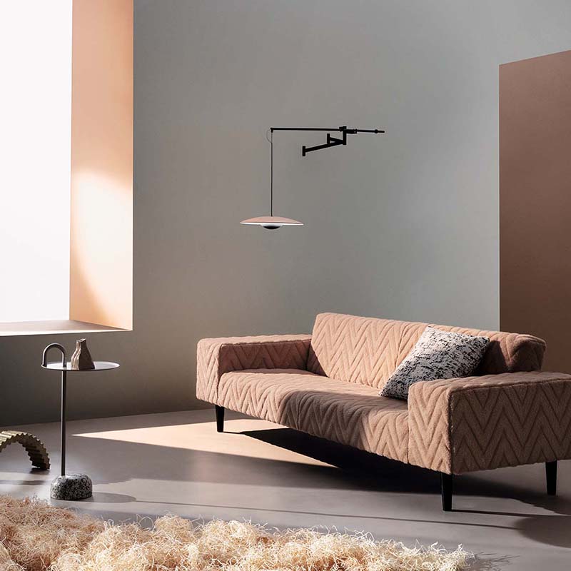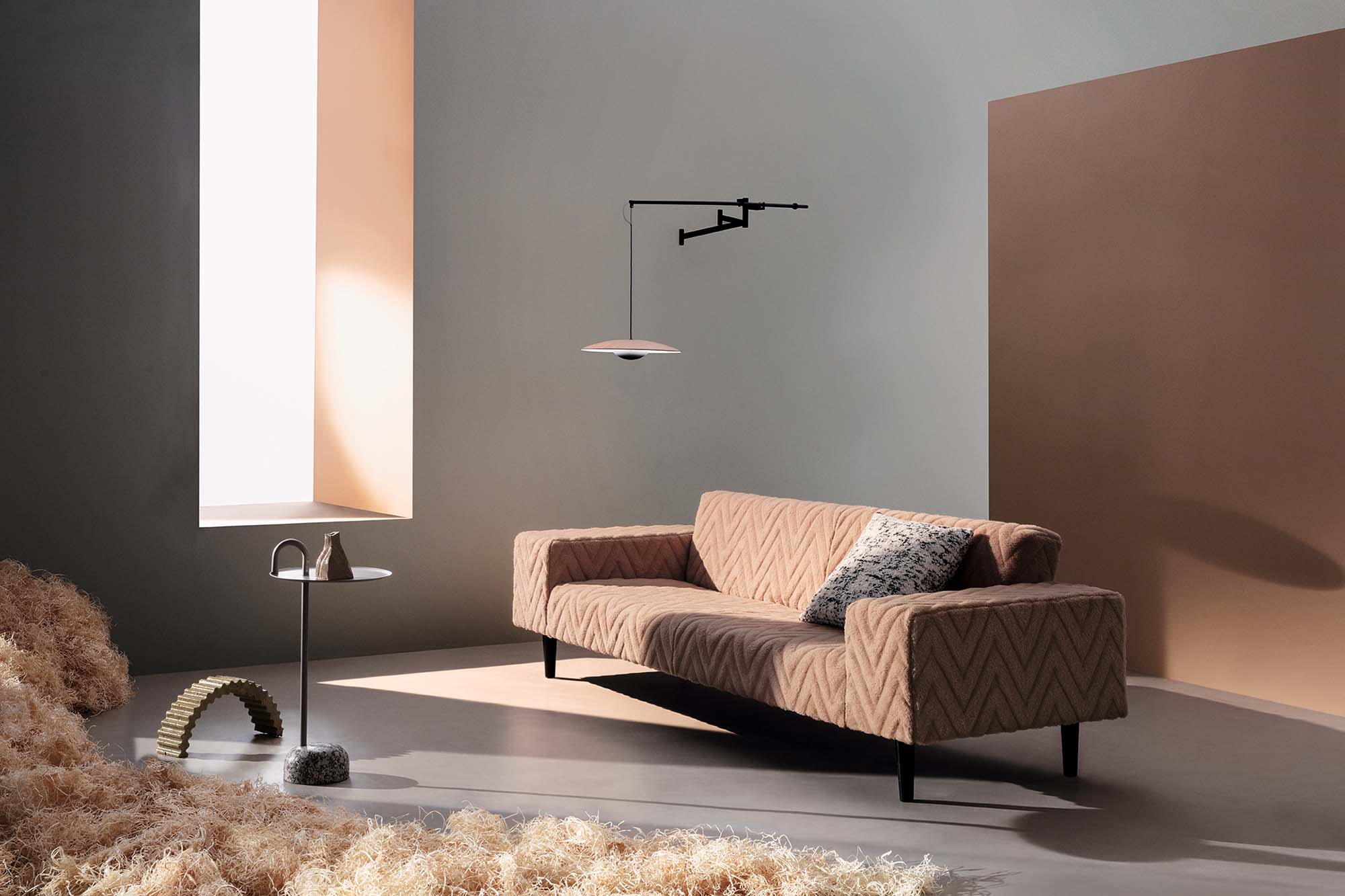 子羊から刈り取ったヴァージンウールをした生地。長さのあるパイルによる高級感のあるテクスチャーが魅力です。特殊なパイルカット技術を用い、大きなヘリンボーンデザインを表現しています。