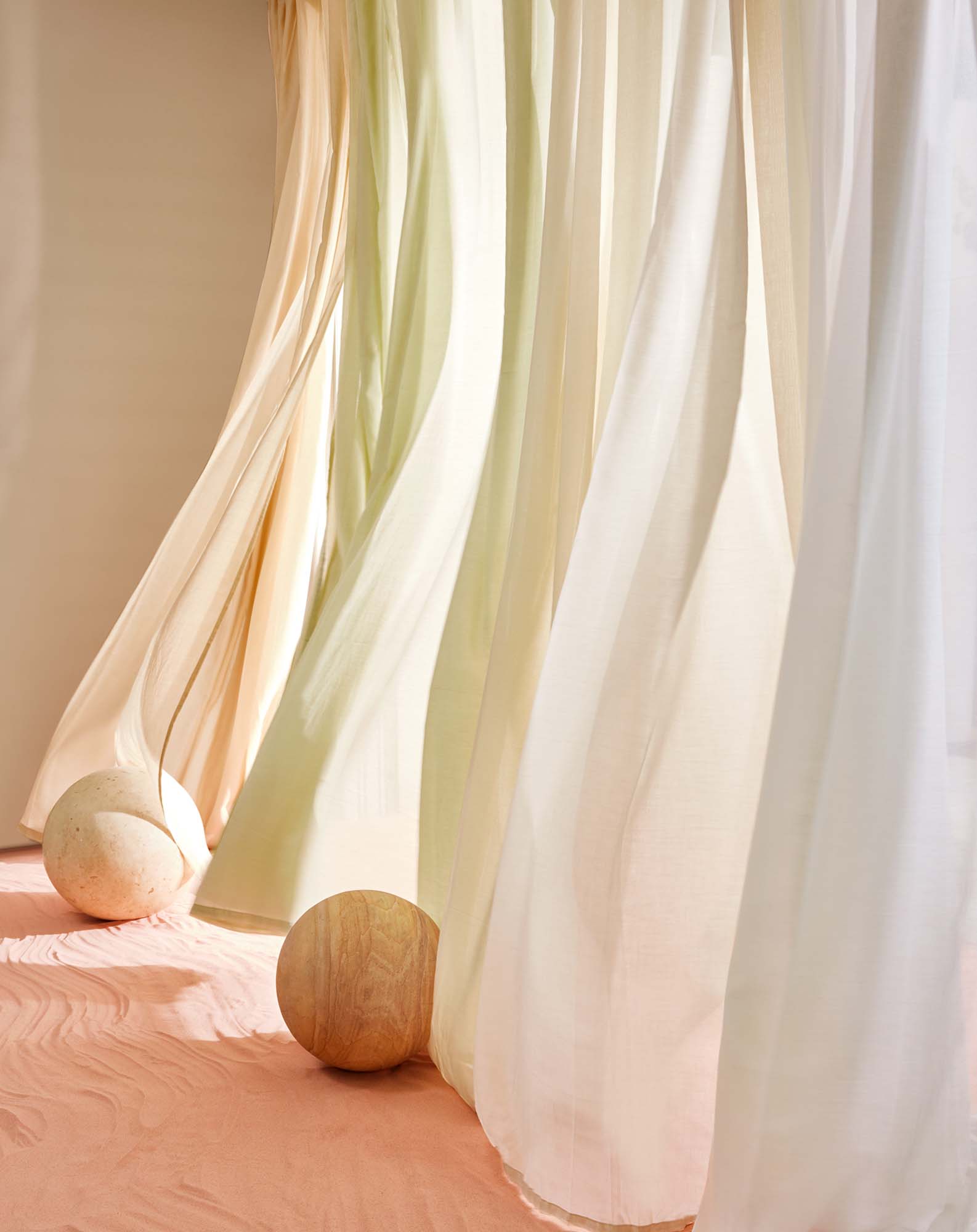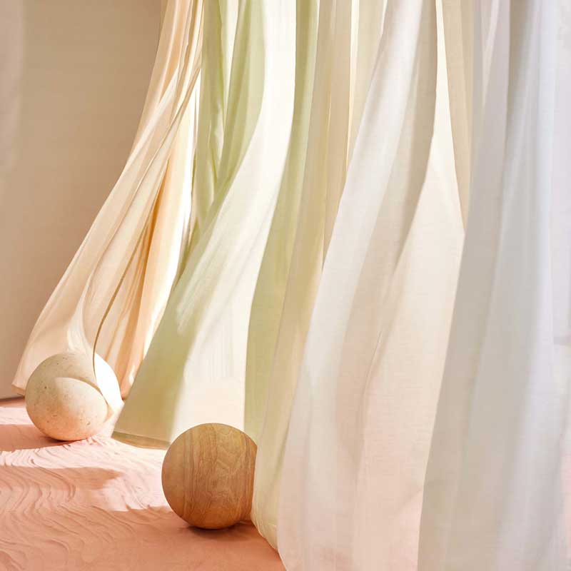 化学薬品や肥料を使わず、水のない環境でも生育するアロエベラ。そして、農薬や肥料を使わず、また高い生産効率で育つオーガニックコットン。このふたつを組み合わせることで実現したサスティナブルなカラーシアー。アロエベラ糸は、アロエからゲルを抽出し、加熱と圧搾によってできたフリース状の物質を紡いで糸を生成しています。