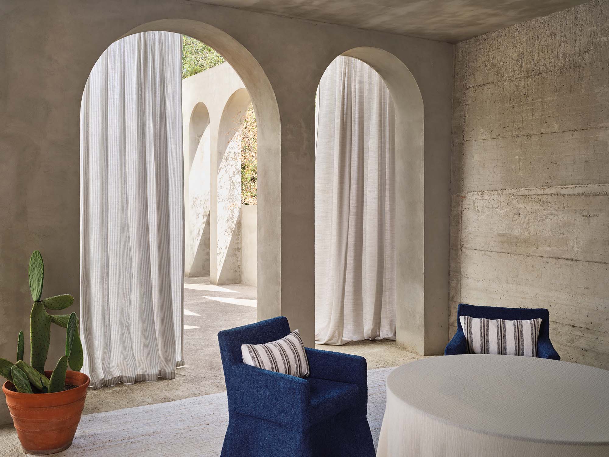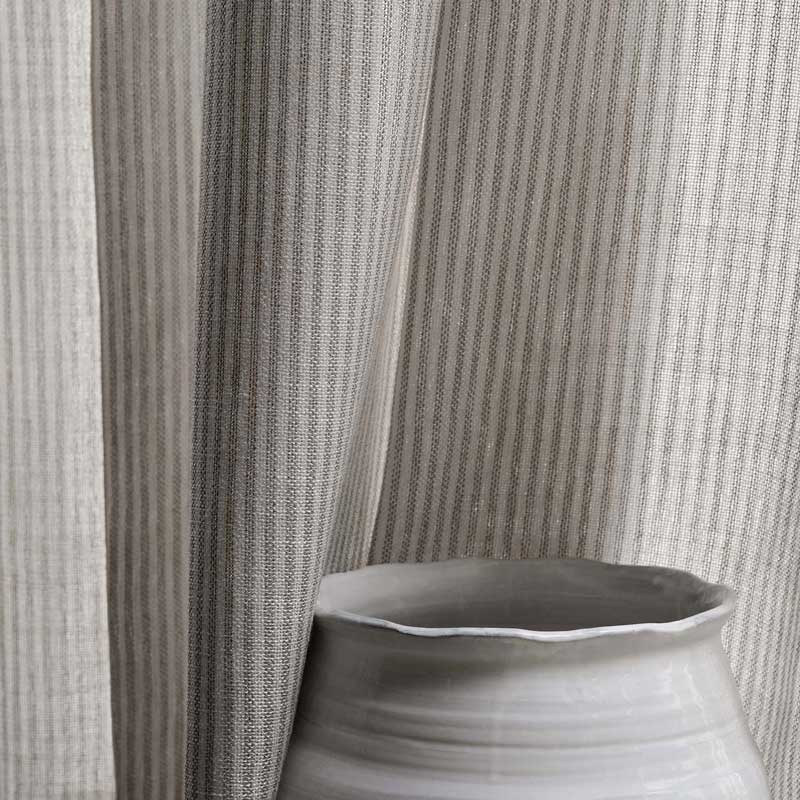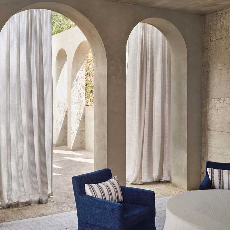 イタリアの邸宅の控えめな美しさからインスピレーションを得たシアー生地。ほのかに光沢を放つ、透け感がある縞の織りが特徴で、カプリ島の海岸線を望む窓辺にそよぐ姿が目に浮かびます。