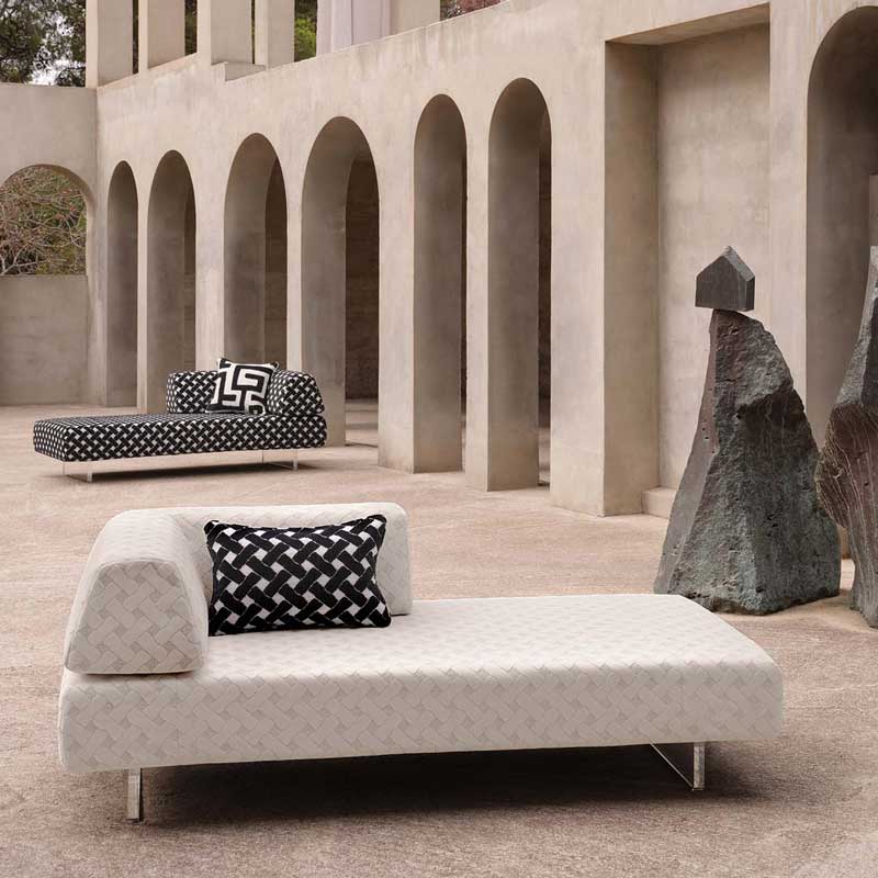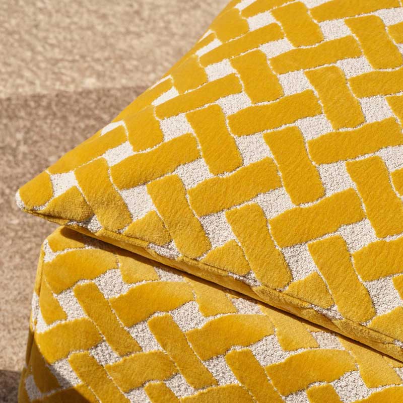 織り方を重ねて表現されたアウトドア用ファブリックで、質感豊かなブークレの地に豊なベルベットの格子模様が施されています。