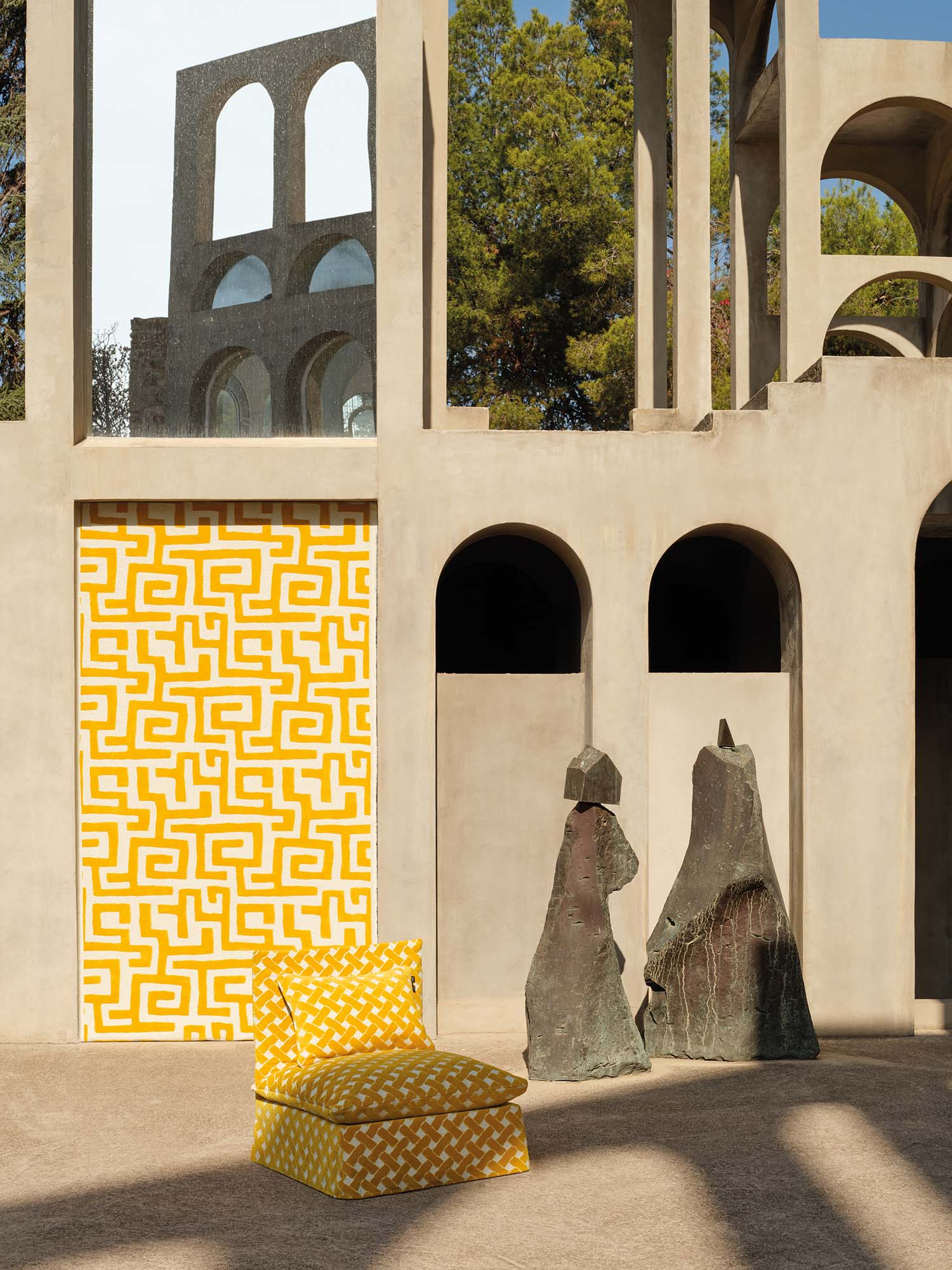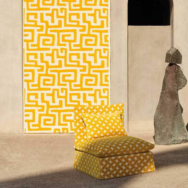 織り方を重ねて表現されたアウトドア用ファブリックで、質感豊かなブークレの地に豊なベルベットの格子模様が施されています。