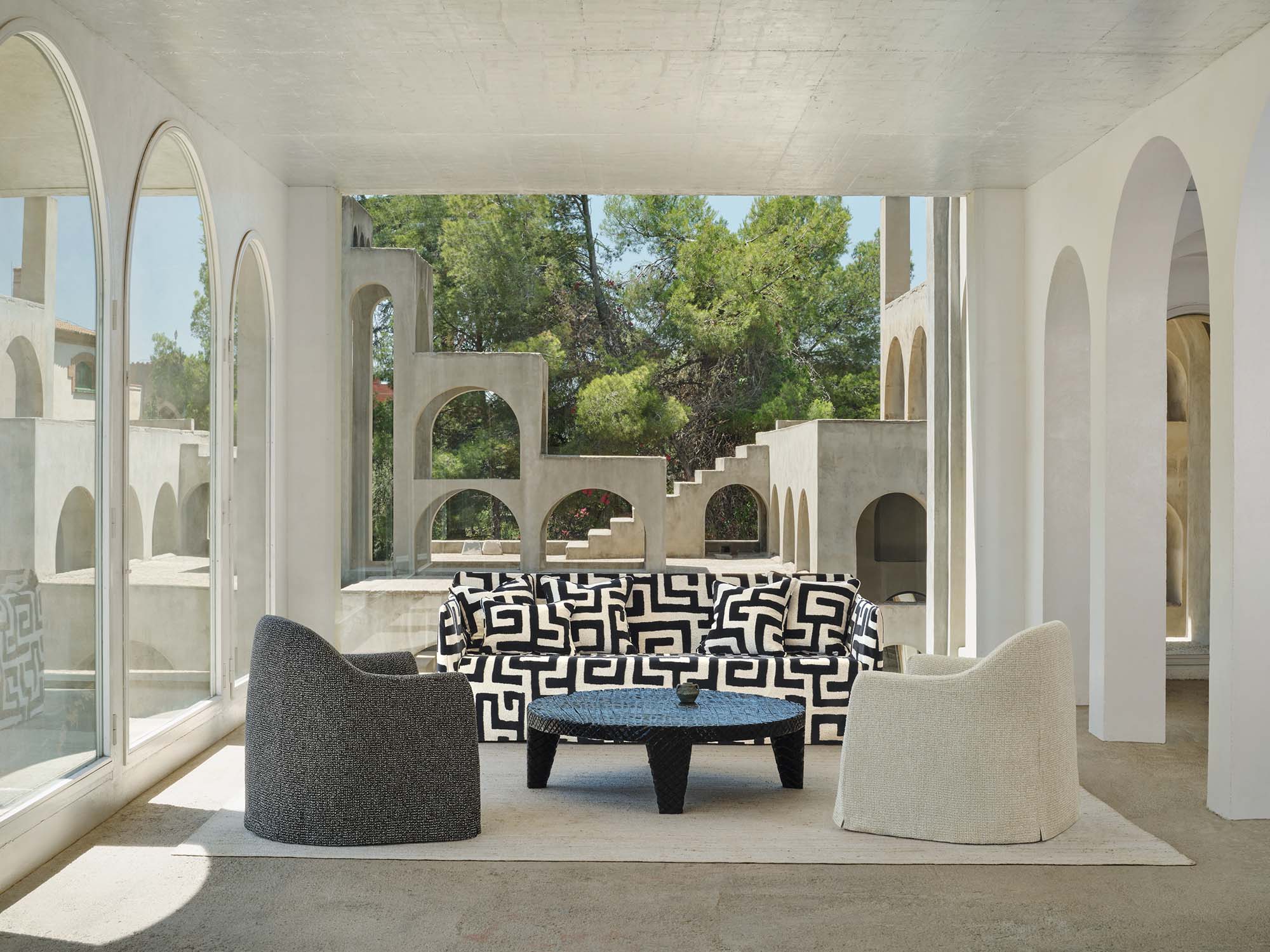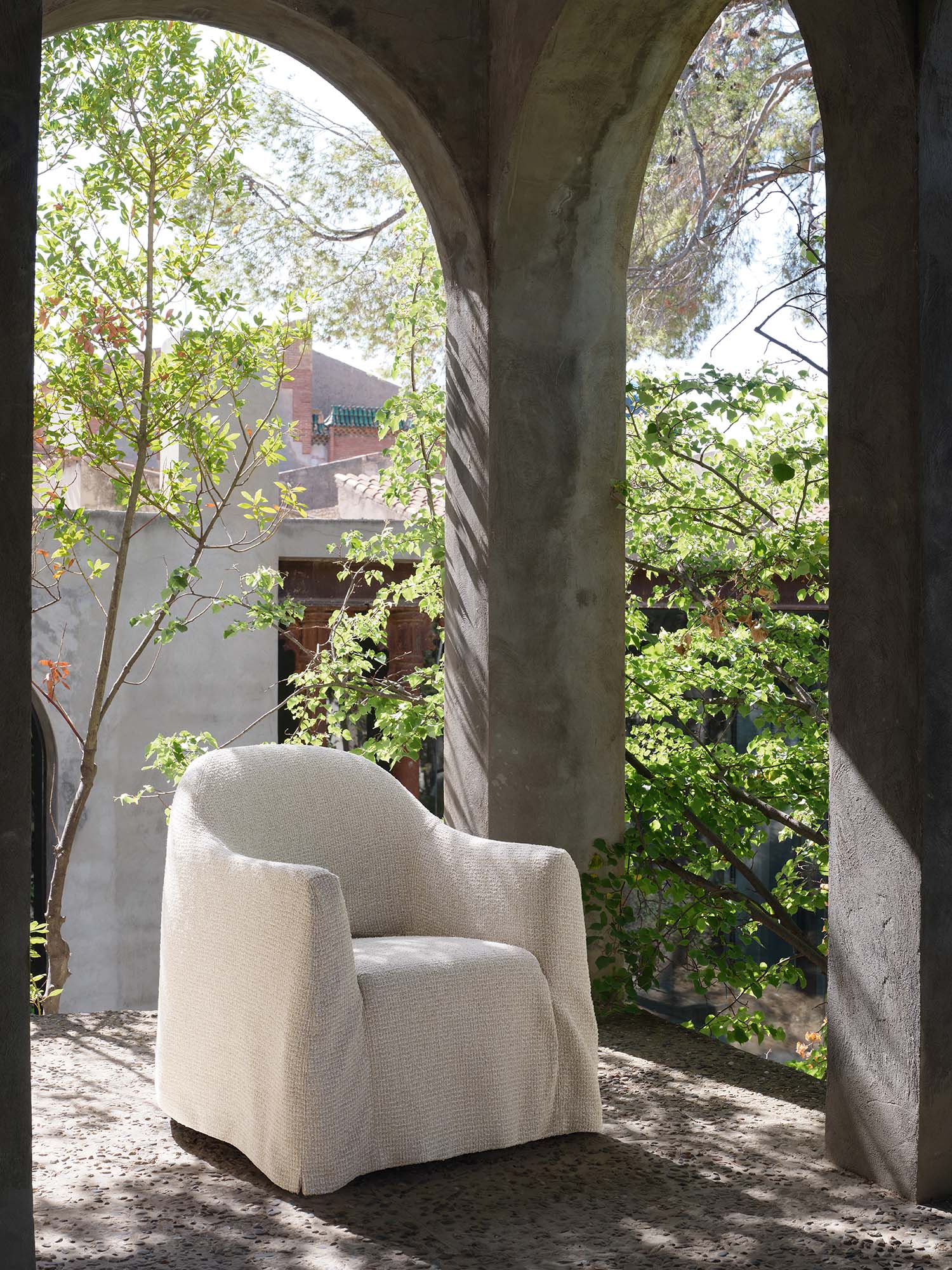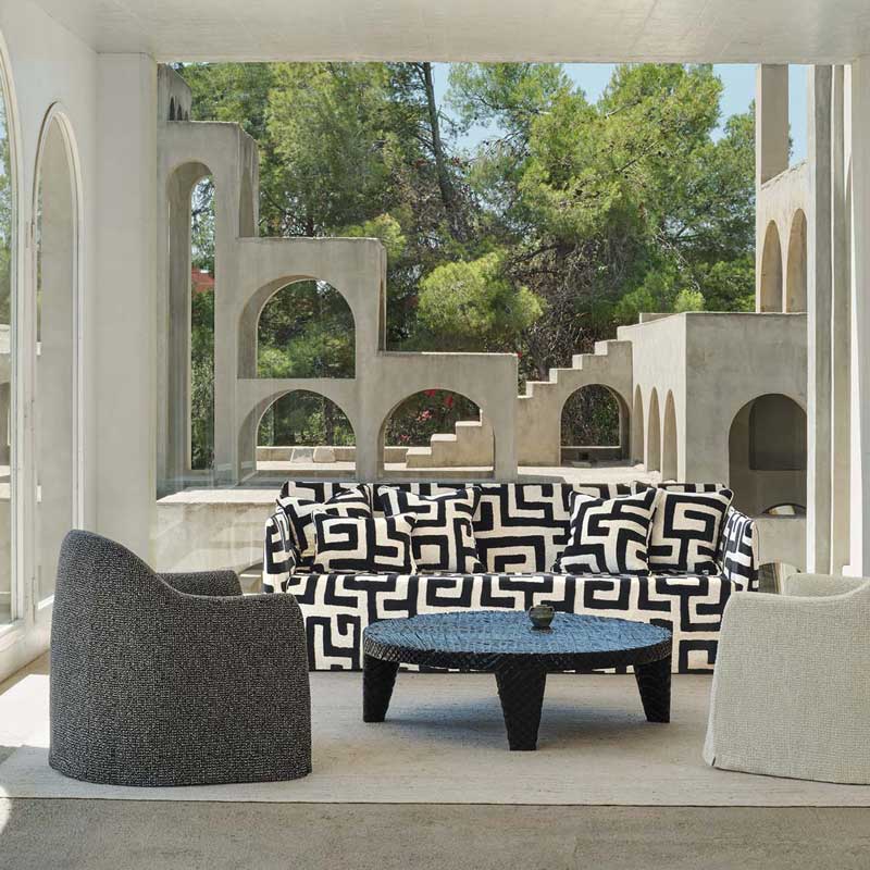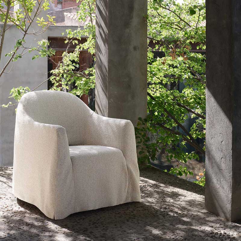 網目模様とブークレ糸で表現されたツイード風の装飾的なアウトドア用ファブリック。思いのほか柔らかく、汎用性の高さが特徴で、椅子の張地や小物使いに控えめなアクセントを加えてくれます。