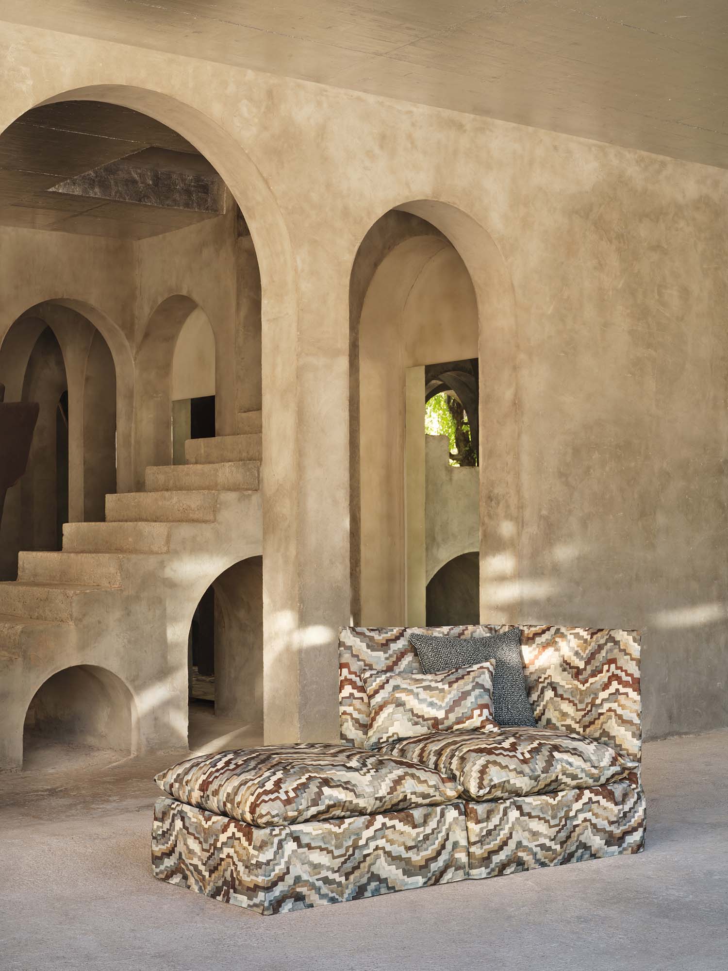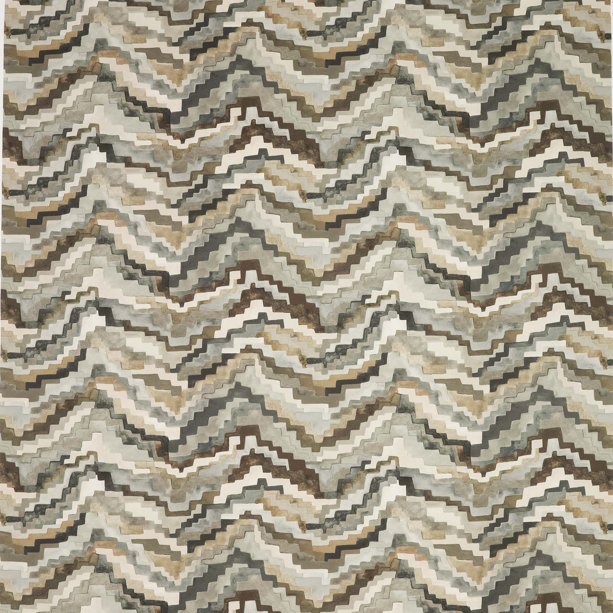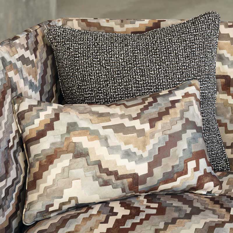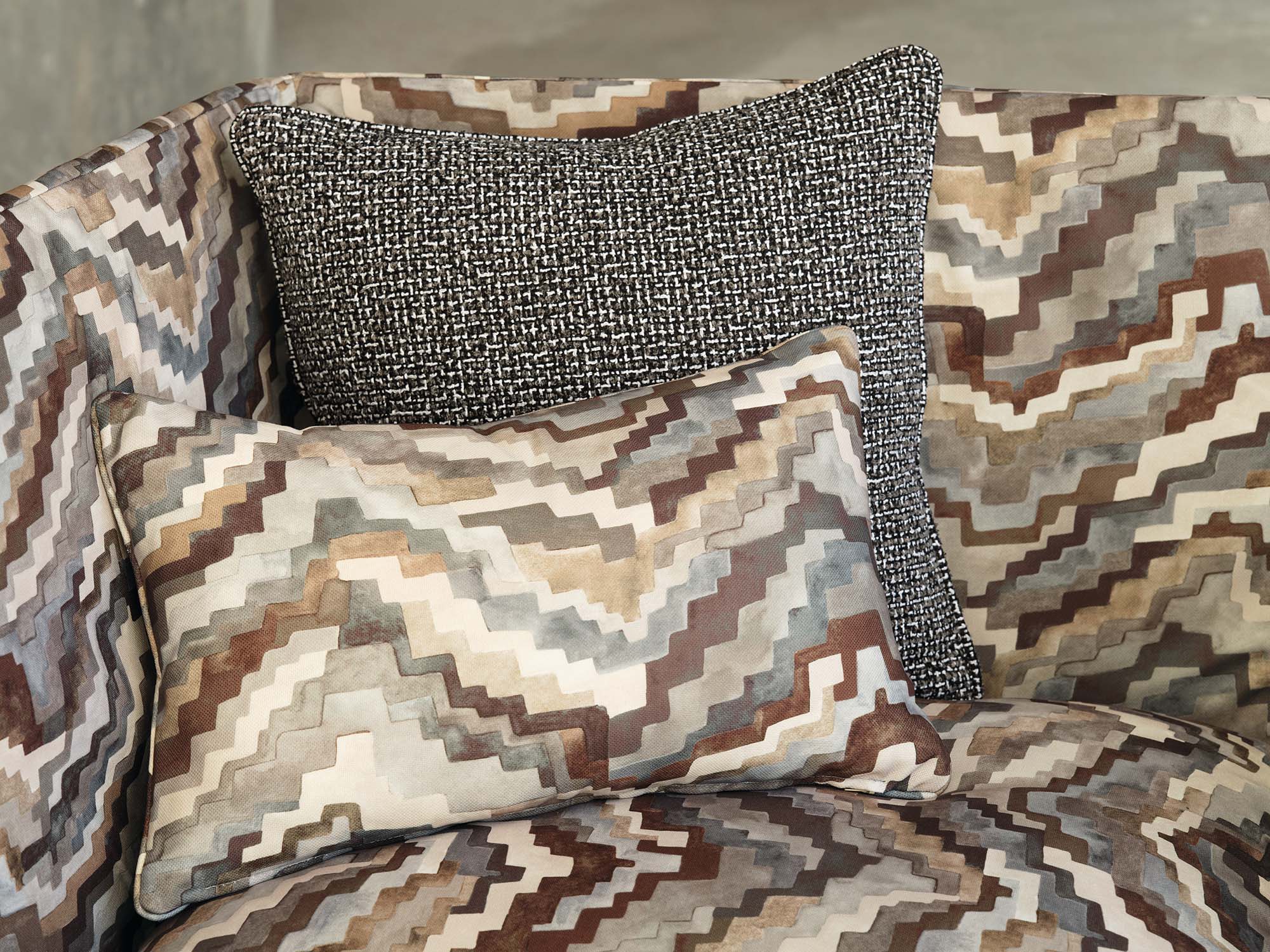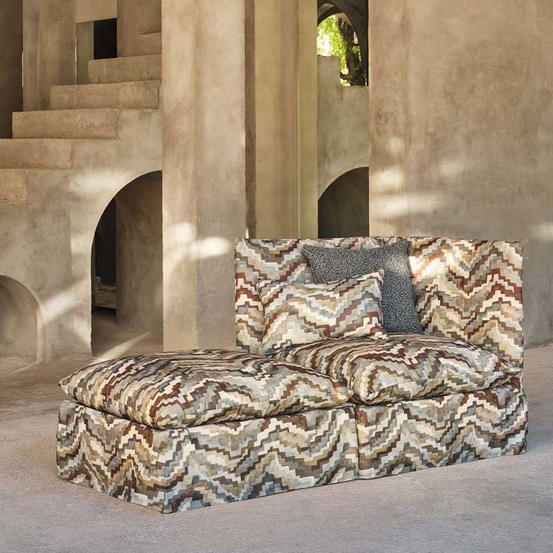 かつて装飾的なベルベットとして登場したアイテムが、モノクロームの傑作へと変貌を遂げました。今回屋外用の主役的プリント生地となったジグラットの原画は、どちらかといえばグラフィックなこのプリント柄に拡散した印象を与えるため、水彩絵の具を使って繊細に手描きで表現されました。